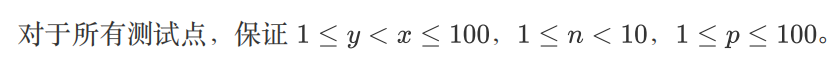 四行,四个正整数x,y,n,p,含义见题目描述。