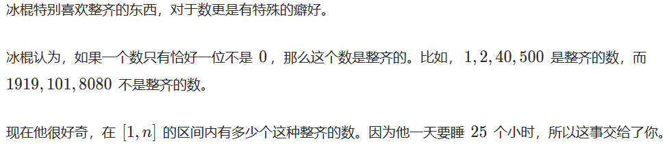 对于每组数据,输出一个整数,表示[1,n] 内有多少整齐的数。