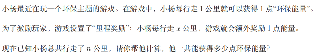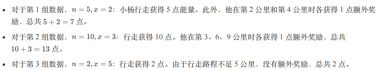 对于每组测试数据,输出一个整数,代表小杨获得的环保能量总数。
