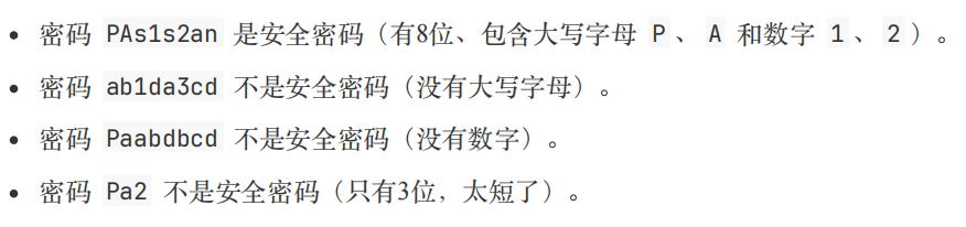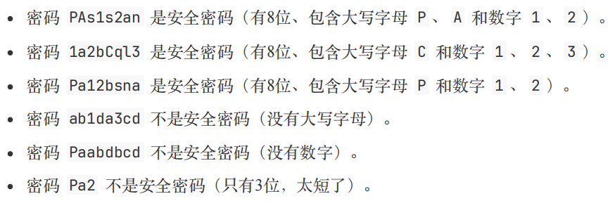 对于每组密码,一行包含一个字符串,代表需要安全检测的密码。