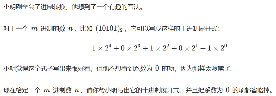 输出一行,为省略了系数为0的项之后的m进制展开式。