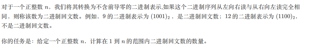 输出一行,包含一个数,表示在1到n的范围内二进制回文数的数量