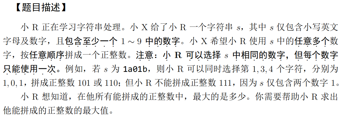 输出一行一个正整数,表示小 R 能拼成的正整数的最大值。