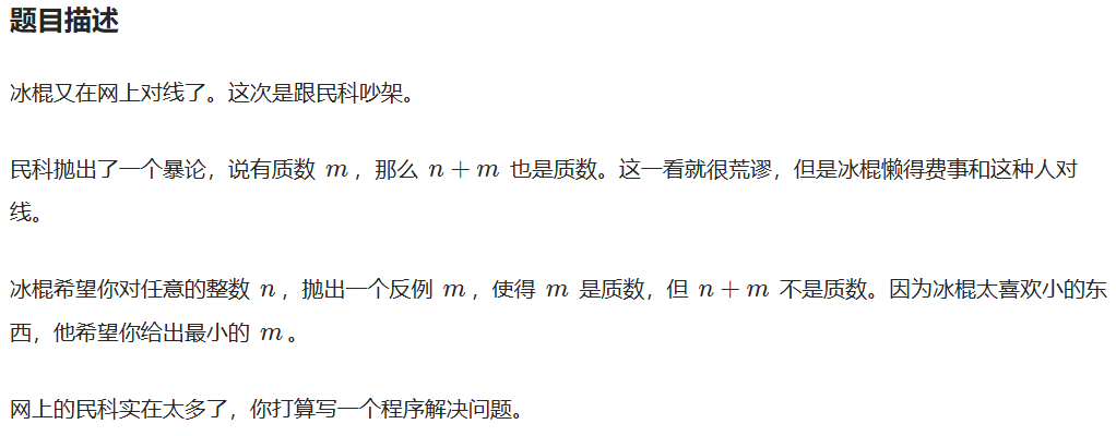 对于每组数据,输出一行一个最小可能的质数m,表示你抛出的反例,使n+m不是质数。
